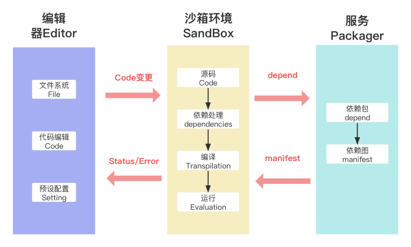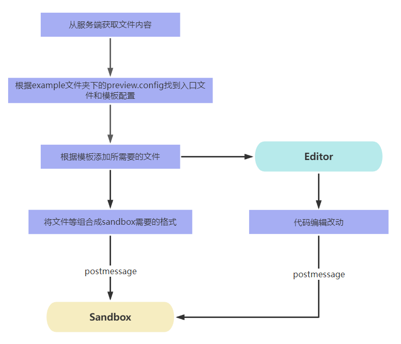 Editor: 用于编辑代码和管理文件的模块。当代码被修改后,通过 postMessage 通知到 SandBox,以便进行相应的处理。