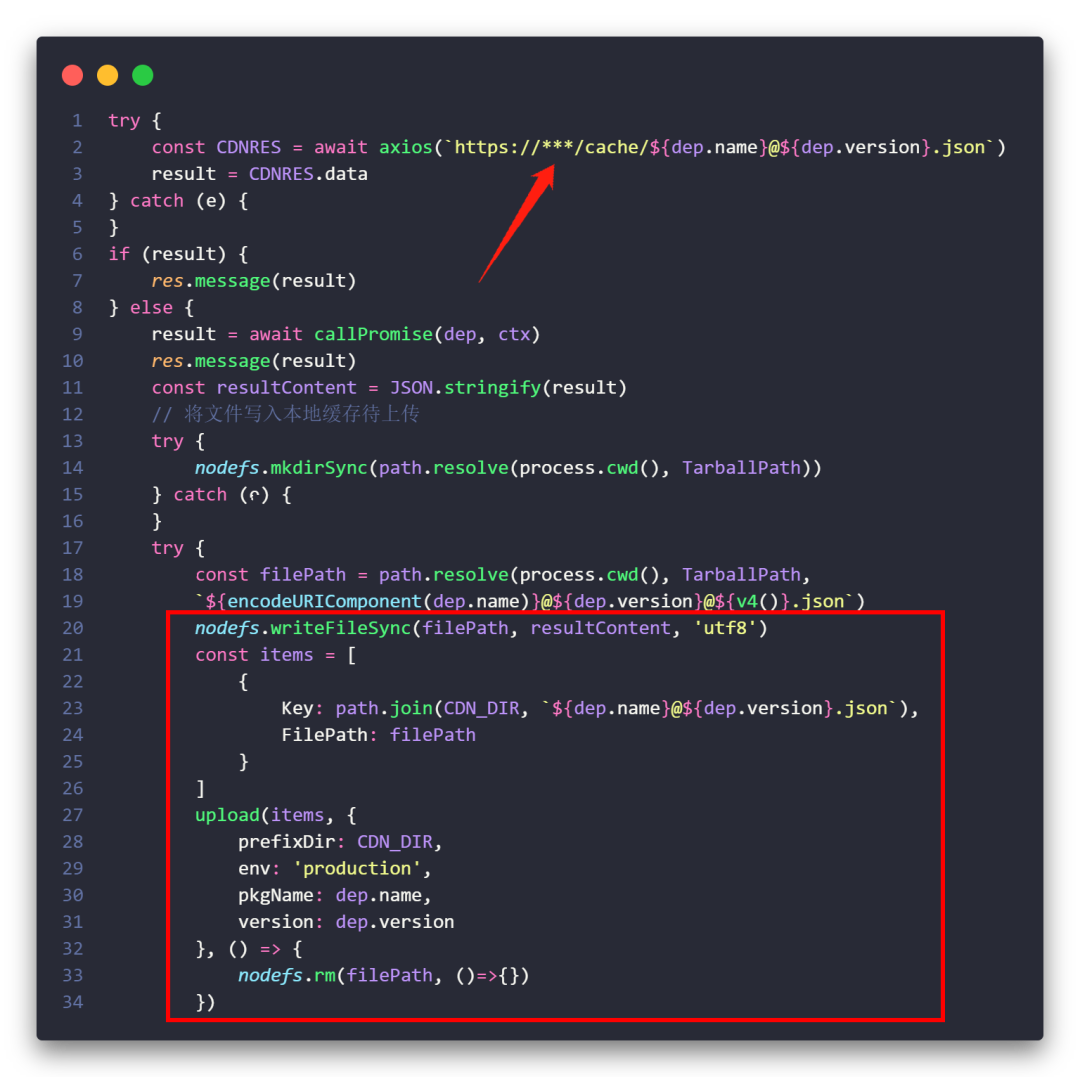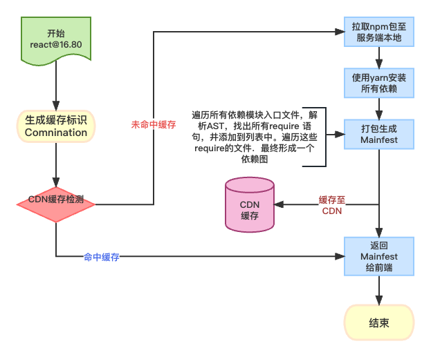 在打包操作前,首先从 CDN 查询相关资源是否存在,存在则直接 JSON,不存在则发起打包操作,并将结果上传至 CDN。