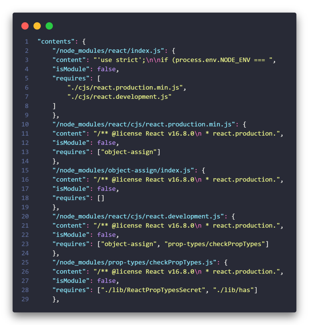 这个文件的生成也是通过yarn在服务端安装依赖,只不过这里为了剔除 npm 模块中多余的文件,服务端还遍历了所有依赖的入口文件 (package.json#main),解析 AST 中的 require 语句,递归解析被 require 的模块,形成一个依赖图,只保留必要的文件,最终输出 Manifest 文件,大致内容如下: 那么在 SandBox 接收到收到一个完整的项目文件,其中包括 package.json,分析其中的 dependencies,剔除一些并不需要的(如@types/*)依赖,接着将每个依赖根据包名@版本生成唯标识,去请求 Packager,拿这个标识去请求服务器,拿到manifest 文件。