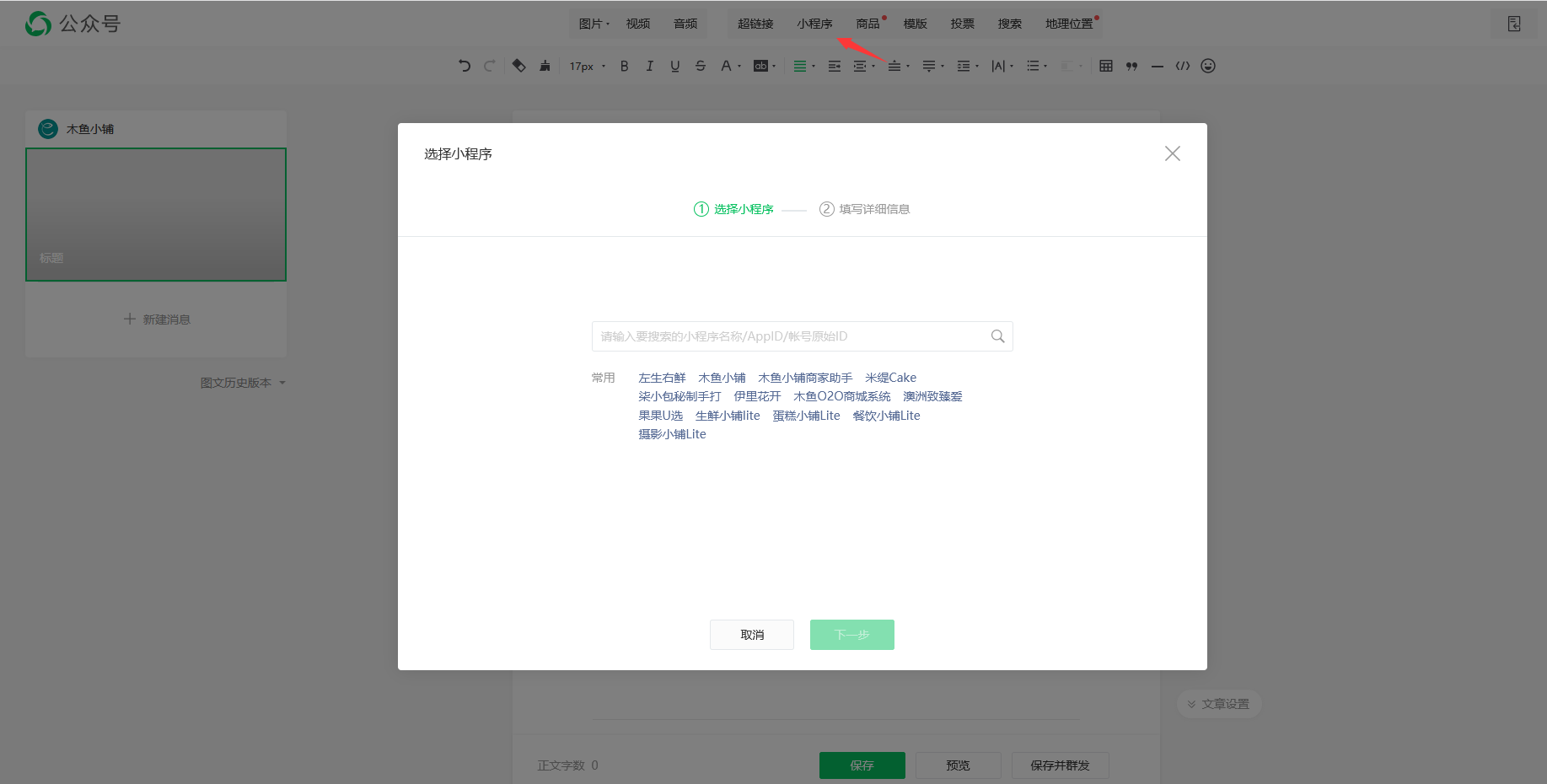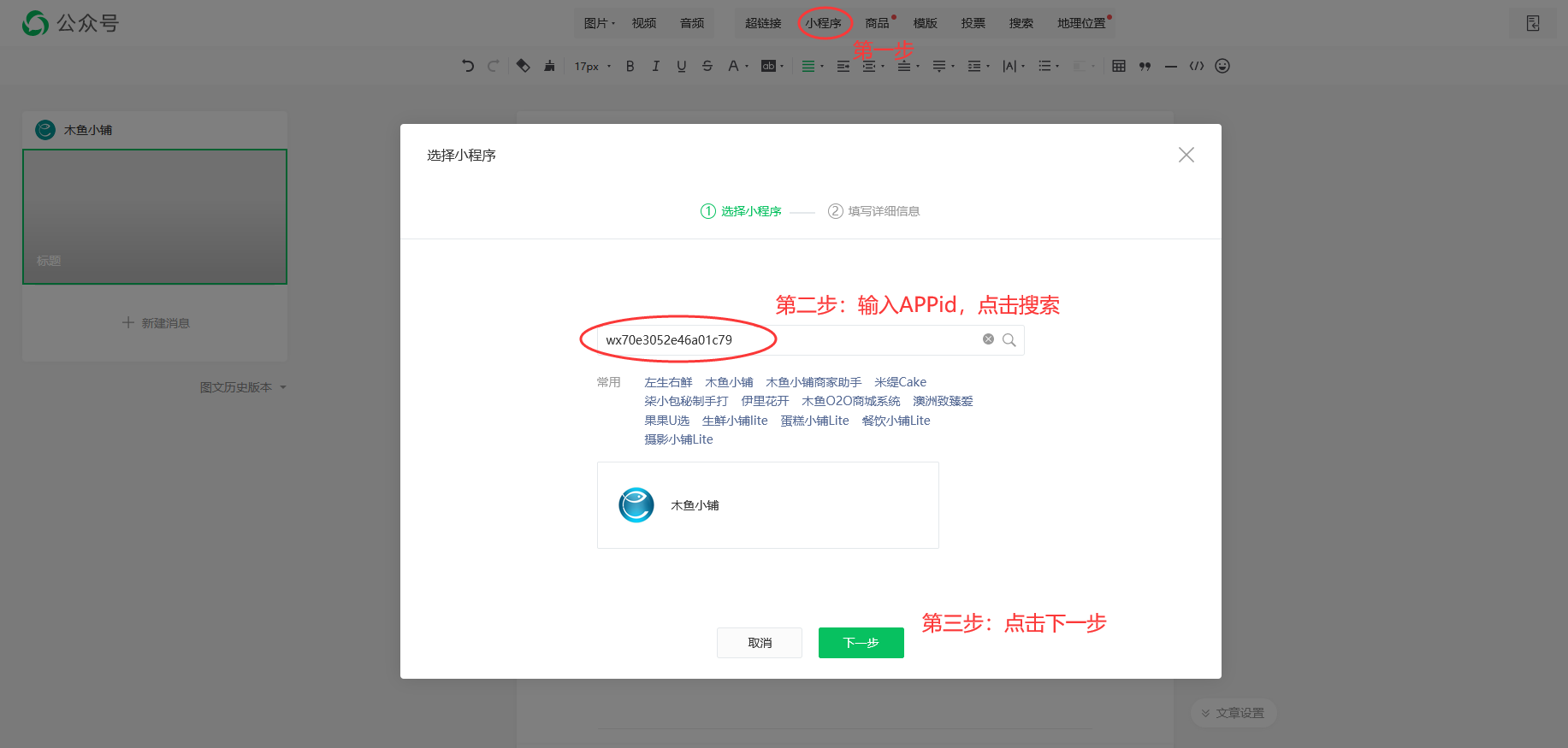 选择您需要插入小程序APPID号或名称,输入完成,点击搜索,出现小程序卡片,点击下一步,即可。