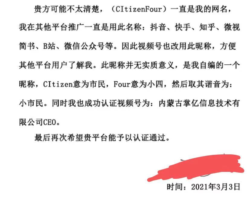 其次是账号名称错误:比如我的视频号和我在社区的名字是一样的都是CItizenFour,审核的时候被驳回,说我的名字没有实质意义。我又写了个文档,说了一下我这个名字的含义,CItizen是市民的意思,Four是小四的意思,然后取了个谐音翻译出来是小市民。然后我说了下我的这个名字再抖音、快手、微视、B站、CSDN、知乎等大部分平台都是这个名字。然后去提交审核,最后是直接通过了的。