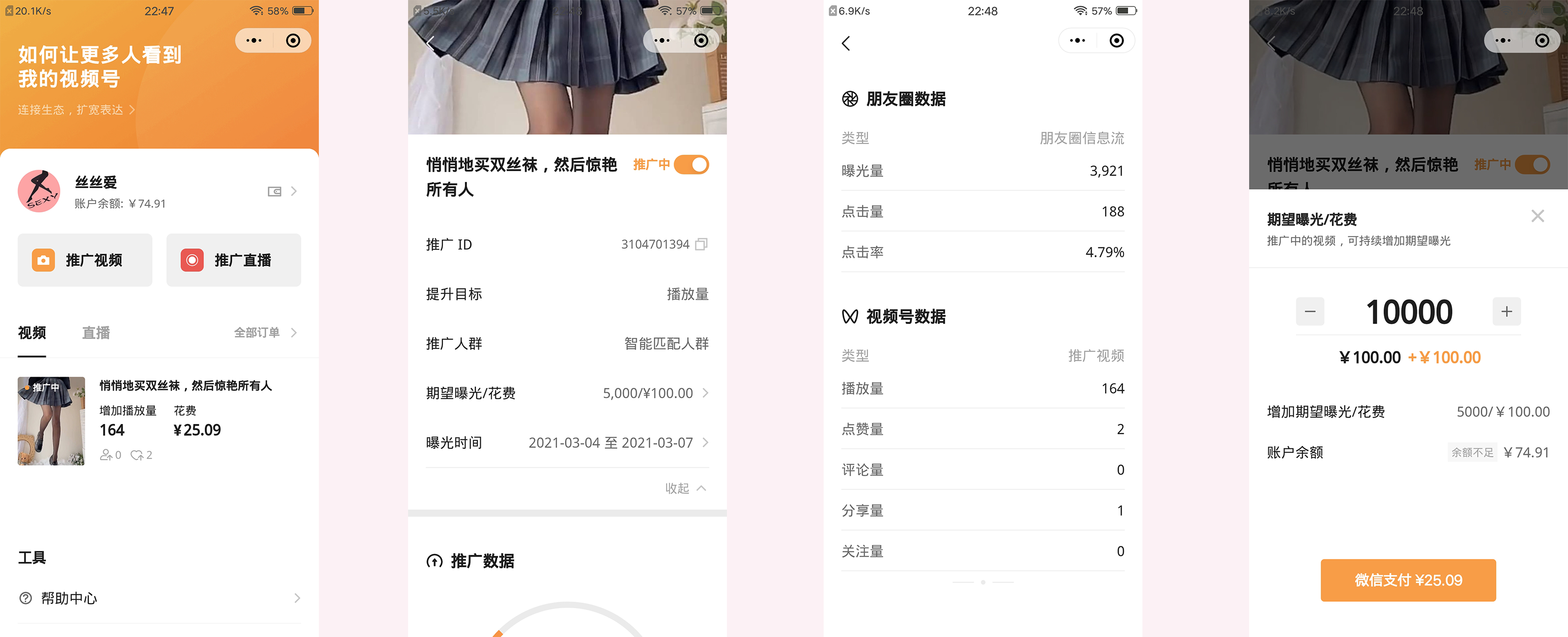 视频号推广审核通过后,我们就可以点击【推广视频】选择视频号发布过的视频进行选择推广,单次推广最低消费100,预计曝光为5000播放量。我们需要提前充值好,直接微信支付充值即可。目前提交视频推广的审核时间大概是3个小时左右,审核通过后就开始扣费推广了。推广期间我们可以暂停推广但是会影响效果,如果推广效果好,可以直接续费无需二次审核。如果想退款可以在推广之前申请退款即可,如果推广正在进行中需要暂停后退款。