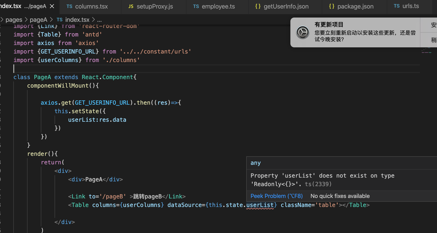 而此刻编译器报错,因为组件的state中没有定义userList这个字段,于是使用ts中的接口对state进行定义