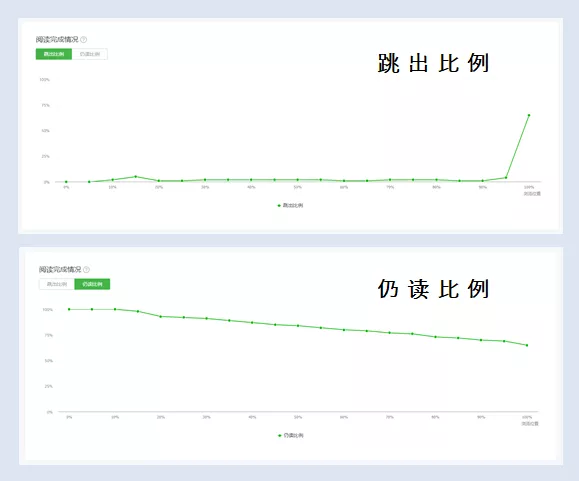 阅读完成情况分为:跳出比例与仍读比例。这两项可是全新的指标,此前的数据板块完全没有。那么,这两项指标,有什么作用呢?