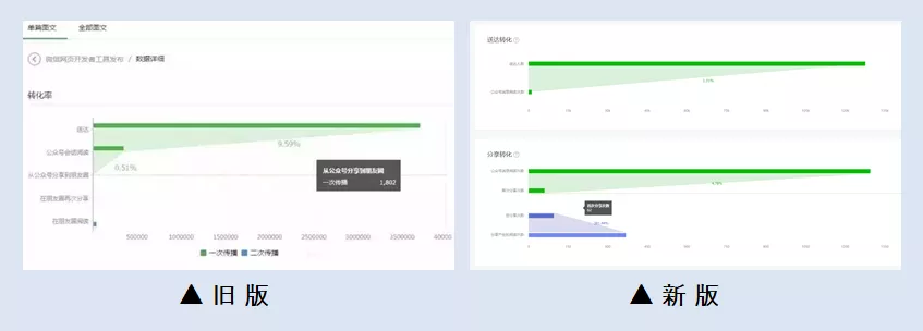文章究竟触达了多少用户?又有多少用户点开了文章?新版后台提供了「送达转化」与「分享转化」两个板块来呈现“触达转化比”数据。