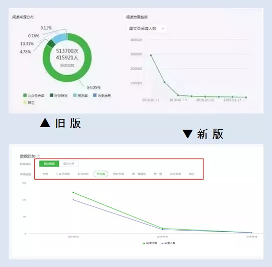 在旧版本的图文数据分析中,公众号运营者其实已经可以很方便地查看不同渠道的阅读来源分布。但新版在此基础上,为运营者提供了颗粒度更细的运营数据。不仅可以查看阅读来源的分布比例,还能跟分别查看每个来源的的每日阅读量、分享量,及变化情况。