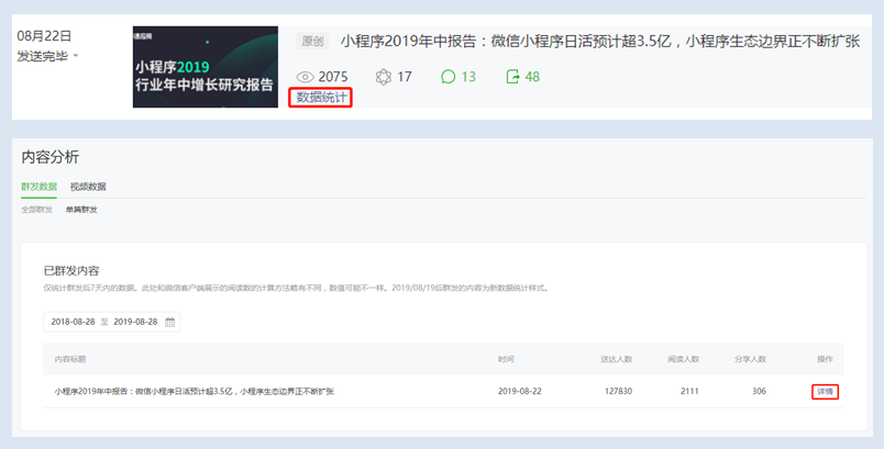 点击 后台首页-已群发文章-数据统计 ,或者点击 菜单栏-内容分析-单篇群发-详情,就能够进入新版的“单篇文章数据分析”页面了。与旧版的单一图表相比,新版页面显得专业和丰富多了,用了整整一页去呈现文章数据。那么,新版究竟增加了哪些数据维度呢?