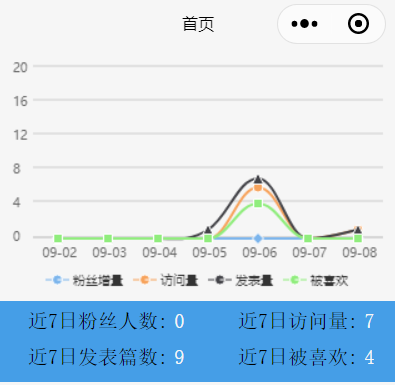 (1)首页主要 数据报表的实时展示和三大类型信息的展示。用户可以通过报表的展示随时知道自己发表的创作所产生的效果如何,通过这样的数据反馈,从而进一步激发作者参与度和不断锤炼自己创作的能力。