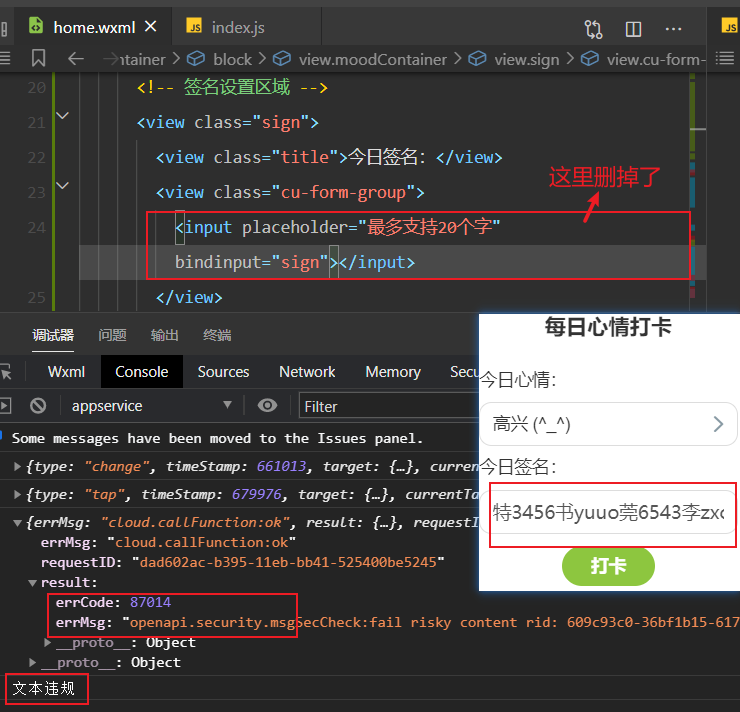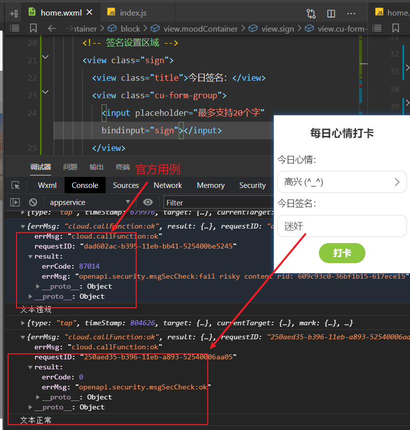 - 自己在练习云开发的时候做了一个用户输入的功能,考虑到需要存到数据库,所以加个内容检测应该更安全一些