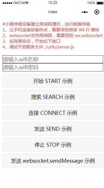 小程序 demo中输入设备广播的热点名称,密码,调用 connect 方法,连接,让小程序和设备进入同一局域网环境。