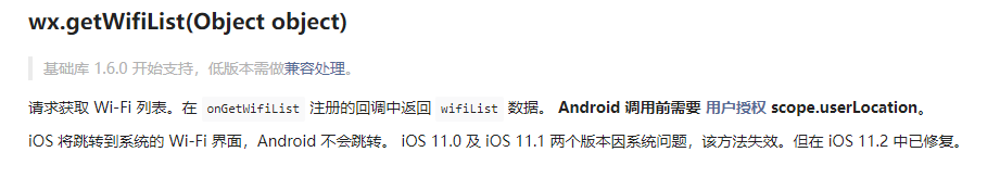 iOS 将跳转到系统的 Wi-Fi 界面,Android 不会跳转。 iOS 11.0 及 iOS 11.1 两个版本因系统问题,该方法失效。但在 iOS 11.2 中已修复