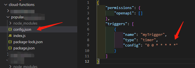 在云函数config.json中创建定时触发器,可以配置多个定时器,type需要是timer,并上传触发器。