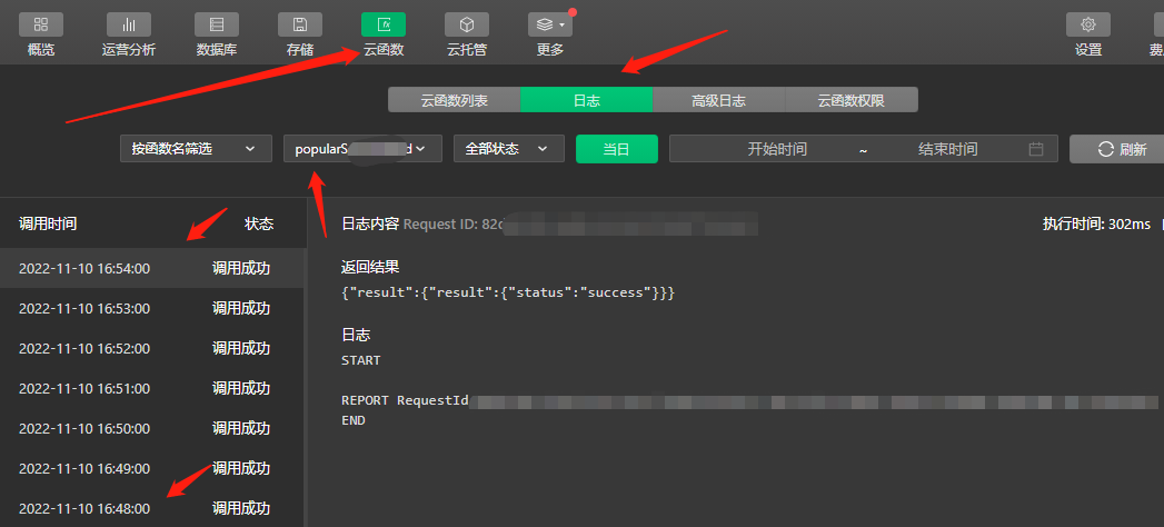 点击打开云函数后台,选择“日志”,选择对应有定时器的云函数,可以在左侧的日志中看到,定时器具体调用时间和次数。