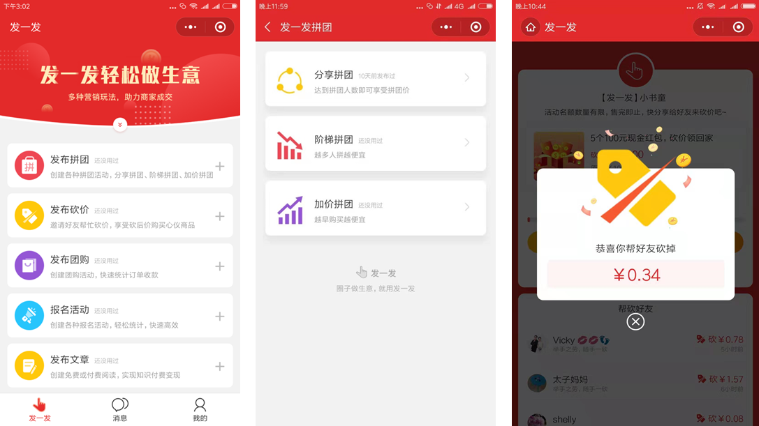 1、分享拼团:这是最经典也是最普遍的拼团模式,商家在发一发微信小程序上发布拼团活动,选择分享拼团,设置成团模式(按大团成本?按小团成团?);设置成团人数及商品成团价格。只要达到成团人数,就可以拼团成功。这种模式应用于食品、餐饮、美容健身、教育培训、母婴、日用百货、汽车房产等消费场景居多。