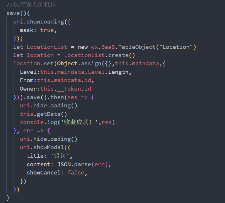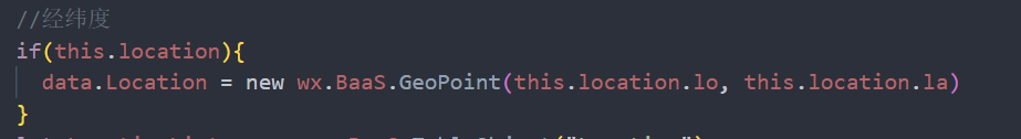 最后,在保存数据时,由于要存储的是 geojson 类型,而 javascript 本身没有这个类型,因此要记得通过知晓云提供的创建地理位置对象方法进行转换: