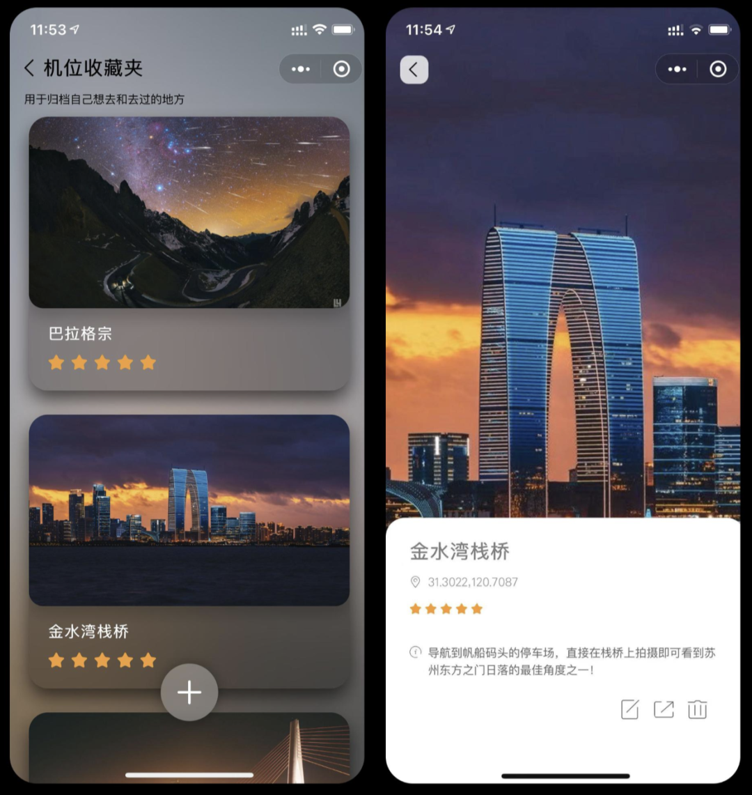 以「机位收藏夹」为例, 这个功能设计用来给摄影师对机位进行记录与分享。在这个功能中,包含了数据的新增、删除、修改、查询四个基本操作。在页面结构的搭建时,我们可以从用户的操作顺序依次开始。