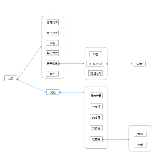 首先,在设计之初,就要求绝大部分功能在点击三下以内完成,页面层级一定不能超过五页。作为一个功能聚合的小程序,在刚打开的首页,便要清晰的展现功能分类,用户点击一下即可看到最重要的信息,而不是一股脑把所有东西都扔给用户,造成屏幕上全是重点以至于用户不知道哪个是重点。另外,考虑到户外拍摄用户可能是戴了手套的,所以功能面板的触摸区域也设置的非常大,方便操作。