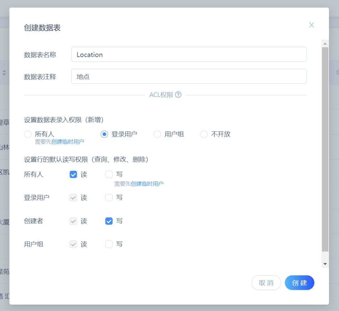 明确流程之后,我们在知晓云后台创建一个数据表,并设置好用户权限。我们的地点可以由创建者编辑,但是其他人只能看(复制这条记录后才能编辑),所以按照下图设置好 ACL 权限: