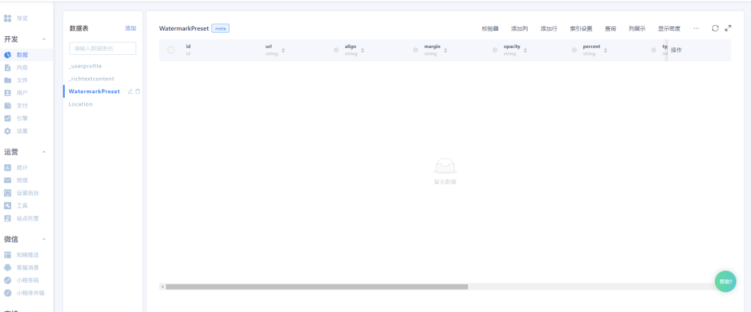 然后我们根据每条记录的内容设计好表字段:标题(Title,字符串类型)、多张图片(Img,数组类型)、地点(Location,geojson 地理坐标类型)、出处(Source,字符串类型)、星级(Level,Integer 类型)、其他信息(Info,字符串类型)、所有者(Owner,number 类型),然后还能根据未来功能的规划,增加标签、评论等预留字段。这里在创建字段时一定要想好,一旦创建好,要更改他的某些属性就很麻烦了(比如变更数据类型)。