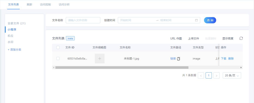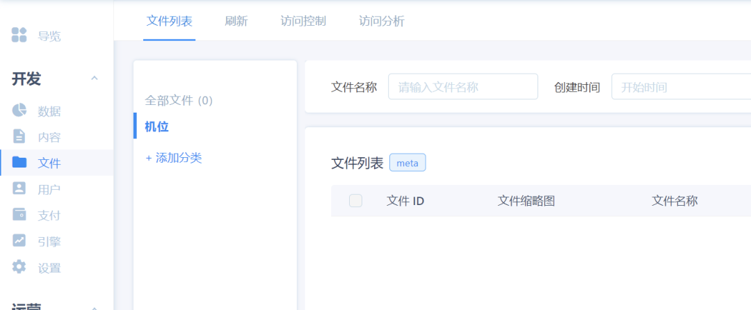 一是图片上传。我们需要在知晓云后台的「文件」模块下,新增一个分类「机位」,后续用户上传的图片将会存储在这里。