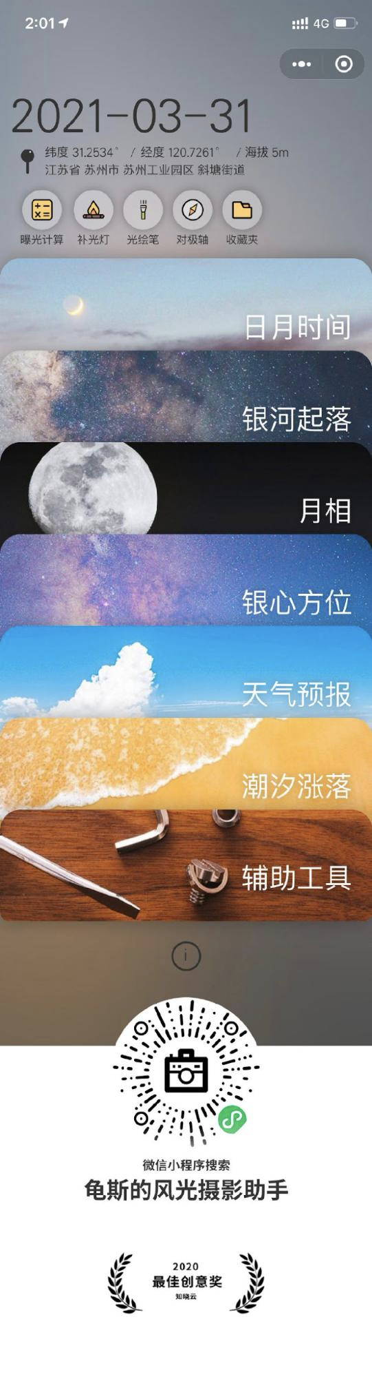 「龟斯的风光摄影助手」提供了日月时间、月相、银河起落等信息,还提供了曝光计算、光绘笔、天气预报和潮汐查询等实用功能,帮助风光摄影爱好者轻松安排拍摄计划。