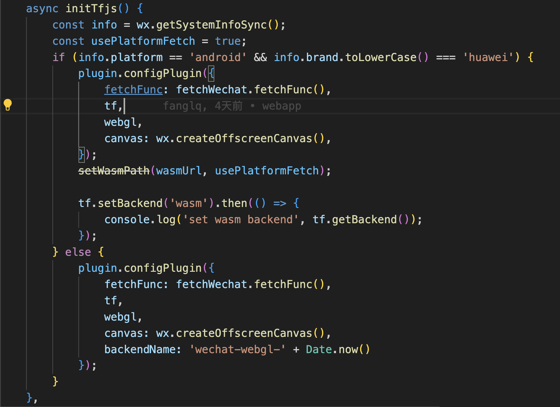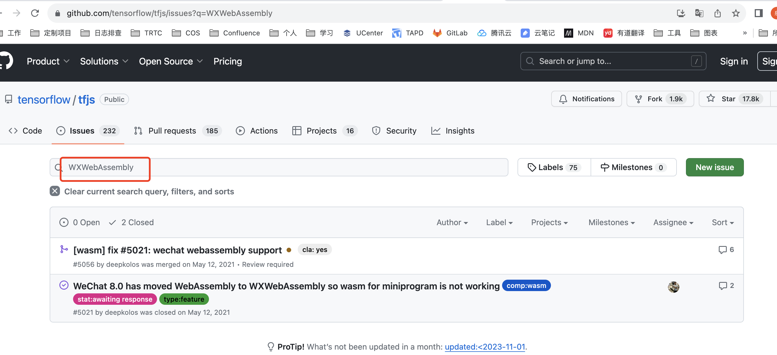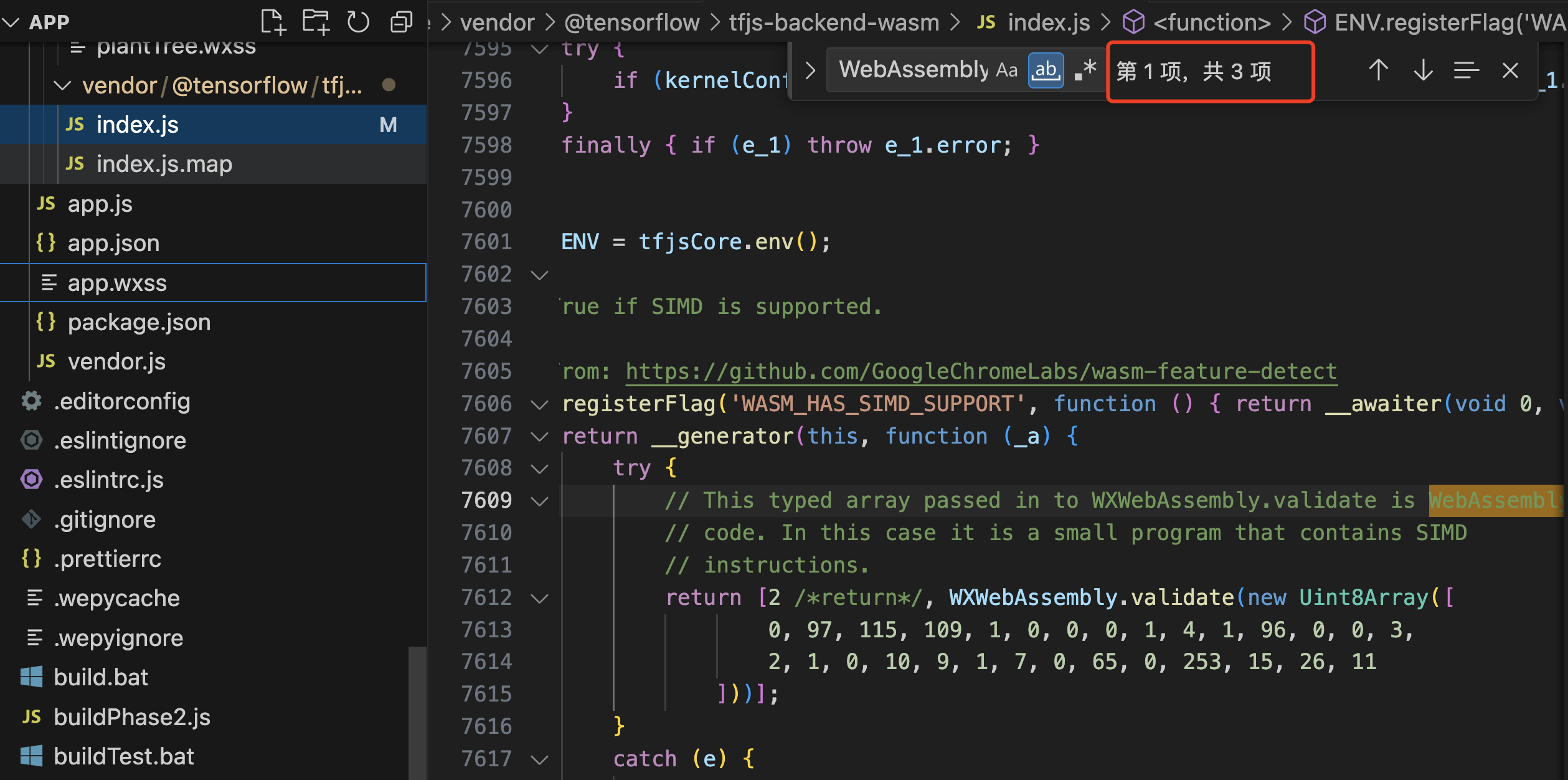 之前的博客提到 tfjs-backend-wasm 这个库中的代码还是使用的 WebAssembly,而微信小程序把 WebAssembly 废弃,改为 WXWebAssembly,所以需要通过rollup插件将编译代码中的 WebAssembly 相关部分,修改为 WXWebAssembly 但是突然发现源码中的WebAssembly 都已经改成 WXWebAssembly了,上Github果然看到了merge记录