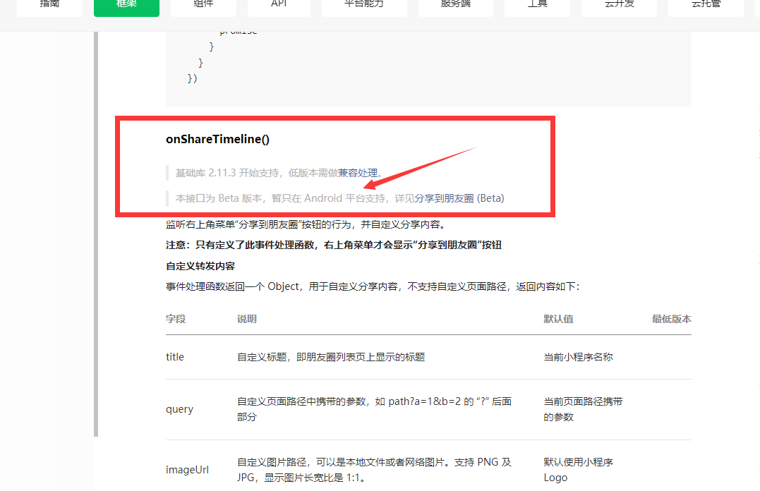 注意点: 1. 分享朋友圈支持持三个参数, 2. 不支持自定义页面路径, 3. 一定要先写onShareAppMessage 4.不支持button按钮触发