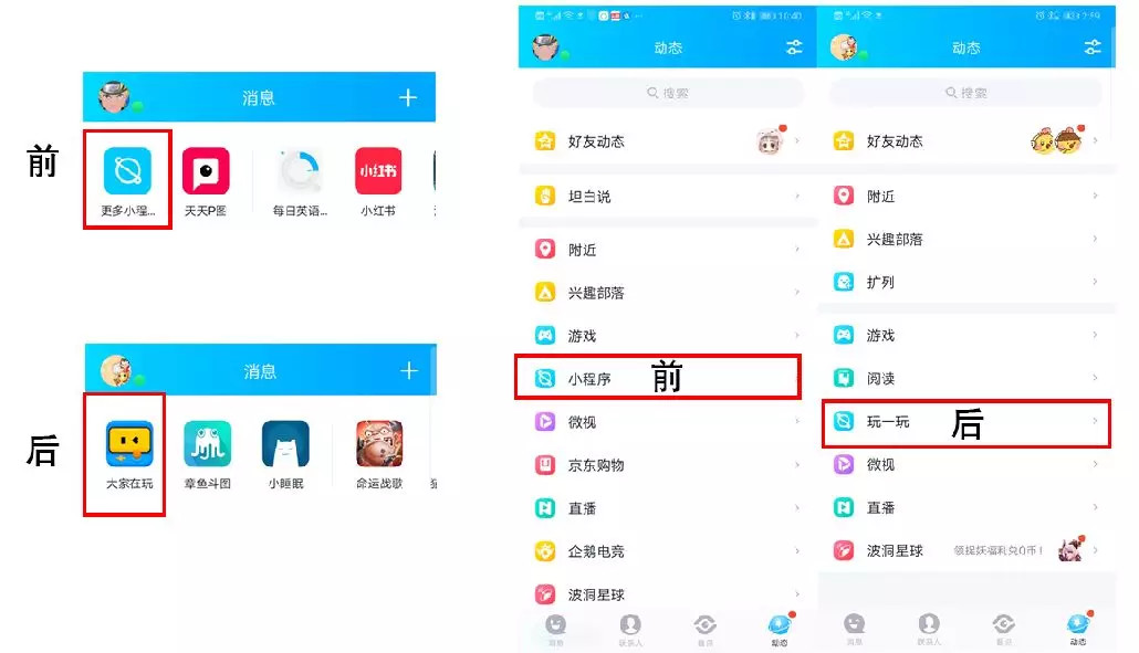 与此同时,QQ小程序近日的两处小更新,似乎也在暗示QQ小程序开发者可以在“玩”的元素上多下功夫。可以看到,QQ小程序中心的名称由之前的“更多小程序”改为“大家在玩”,原来动态界面的小程序入口目前也更名为“玩一玩”,两者共同突出娱乐互动的属性。