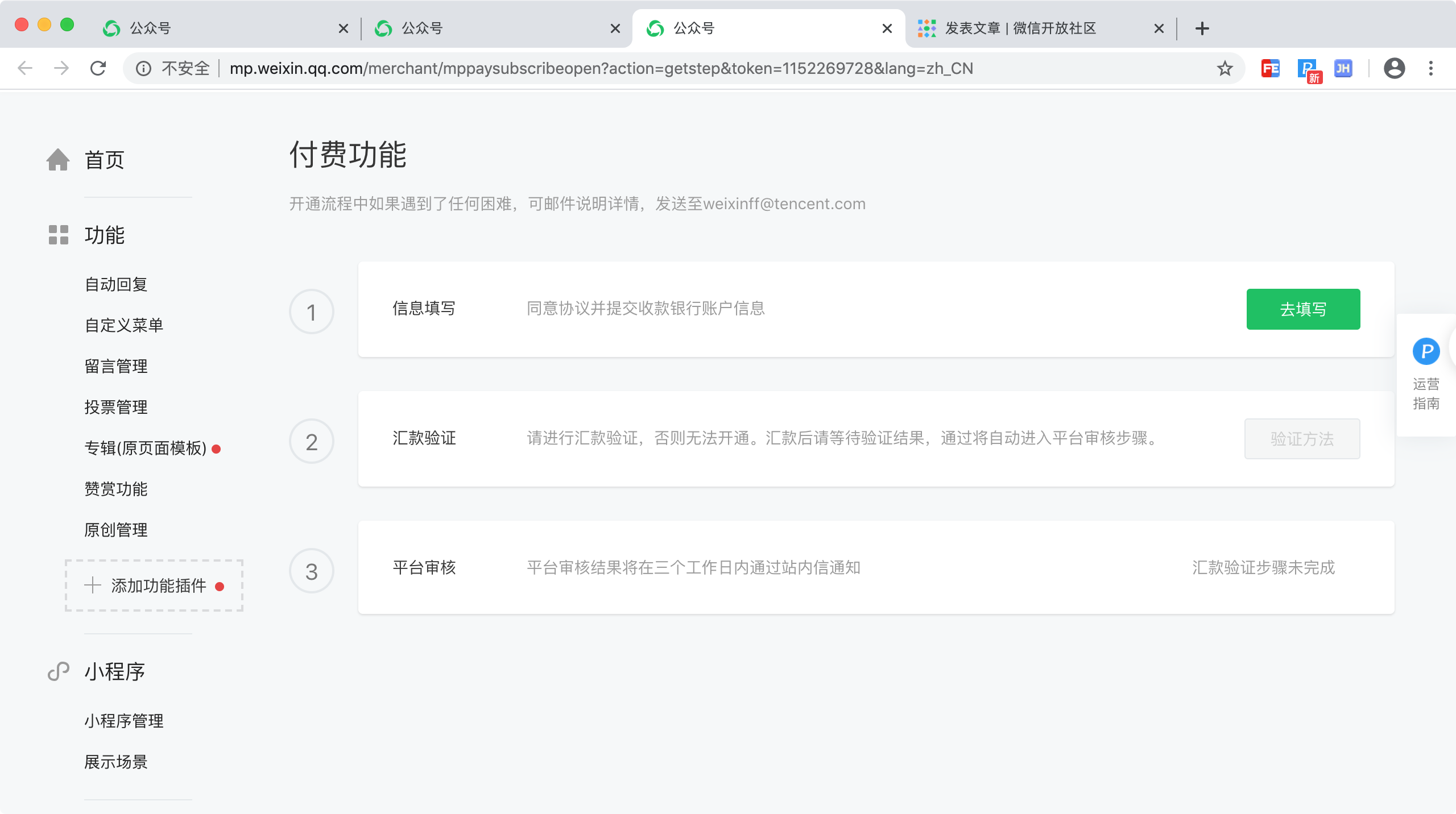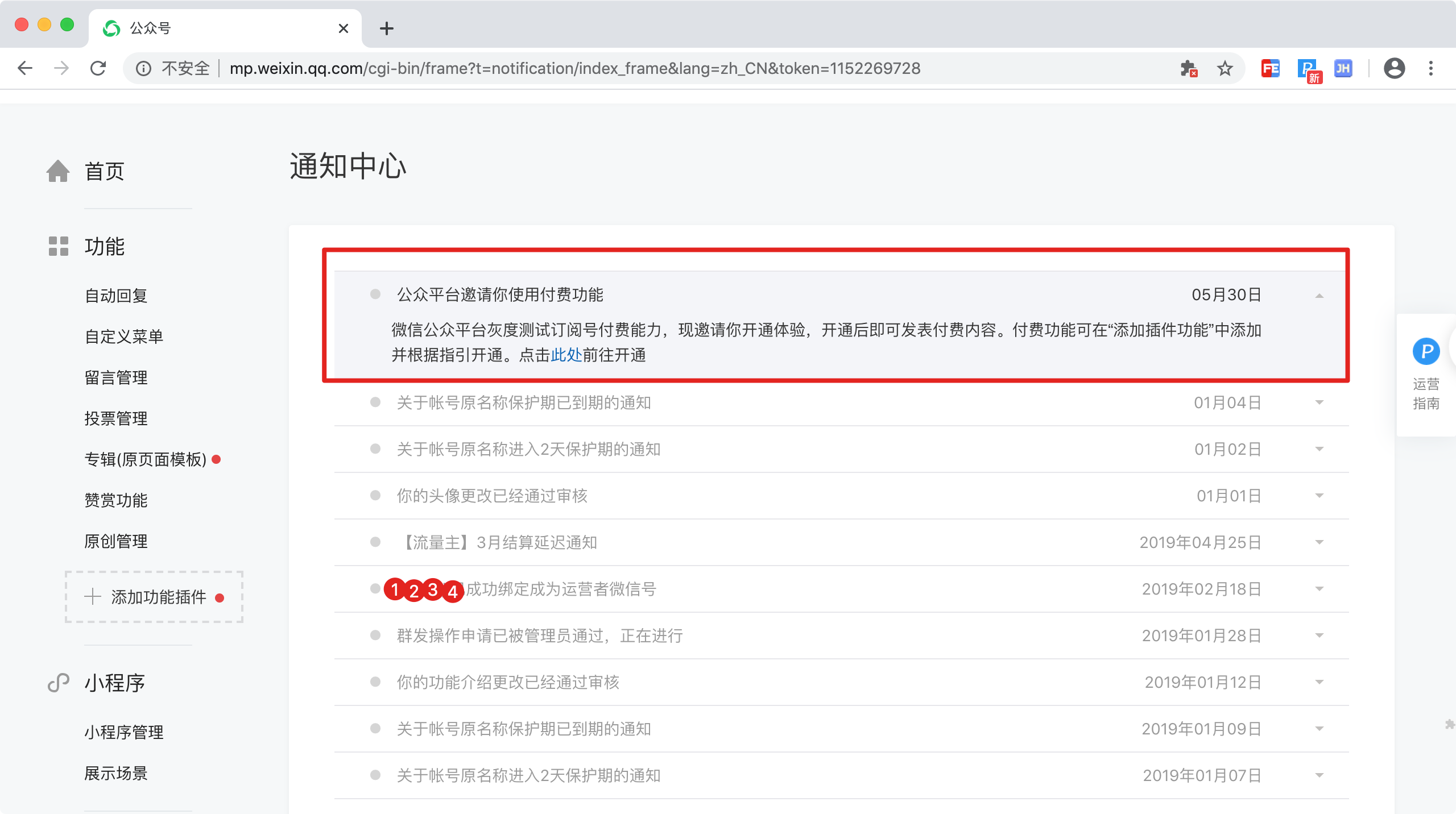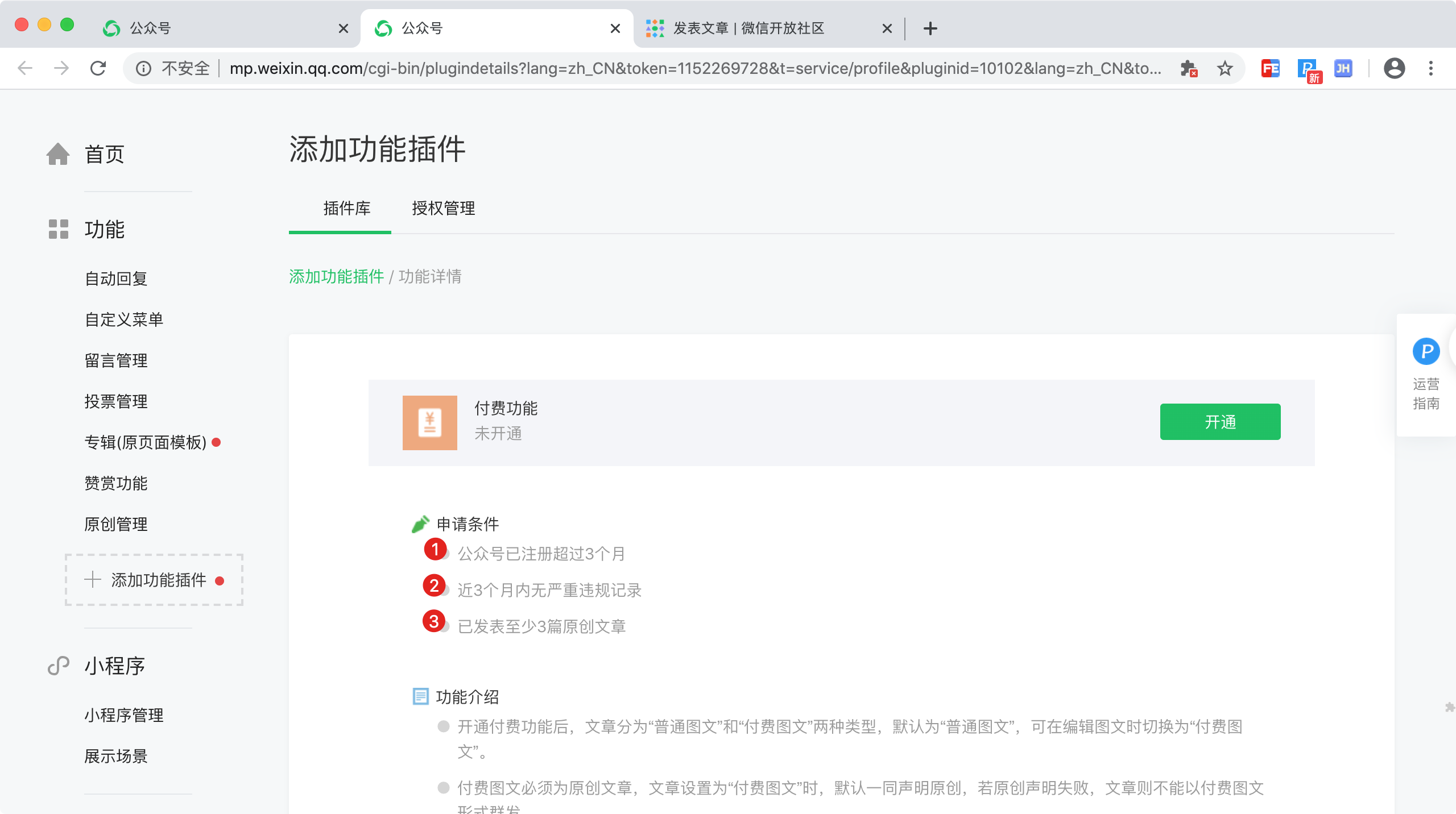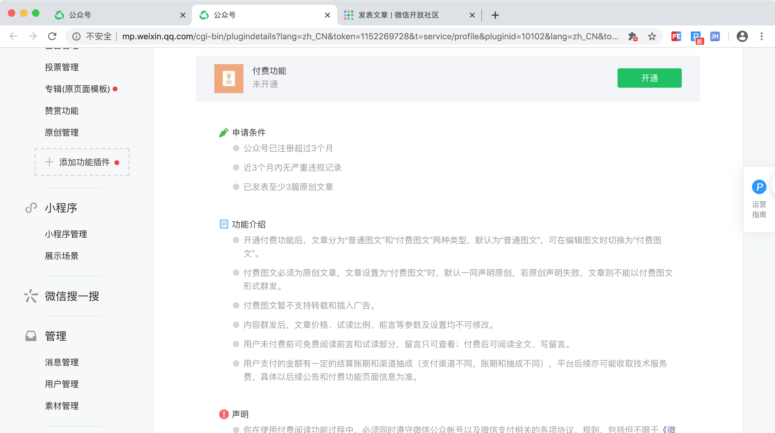 微信公众平台灰度测试订阅号付费能力,现邀请你开通体验,开通后即可发表付费内容。付费功能可在“添加插件功能”中添加并根据指引开通。点击此处前往开通