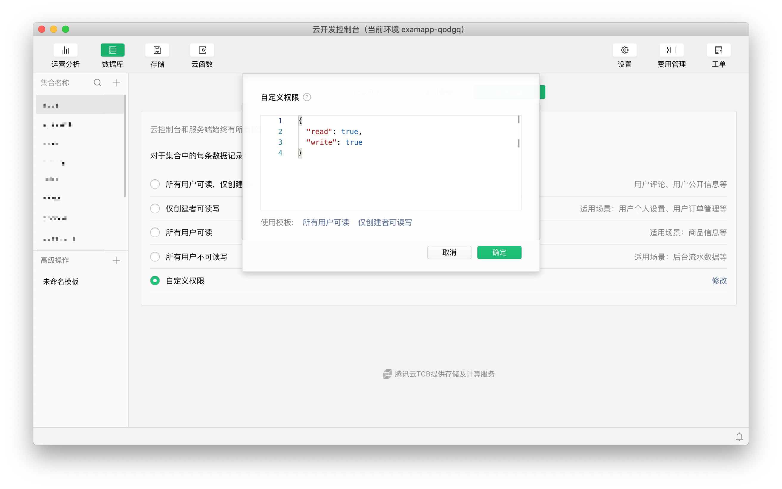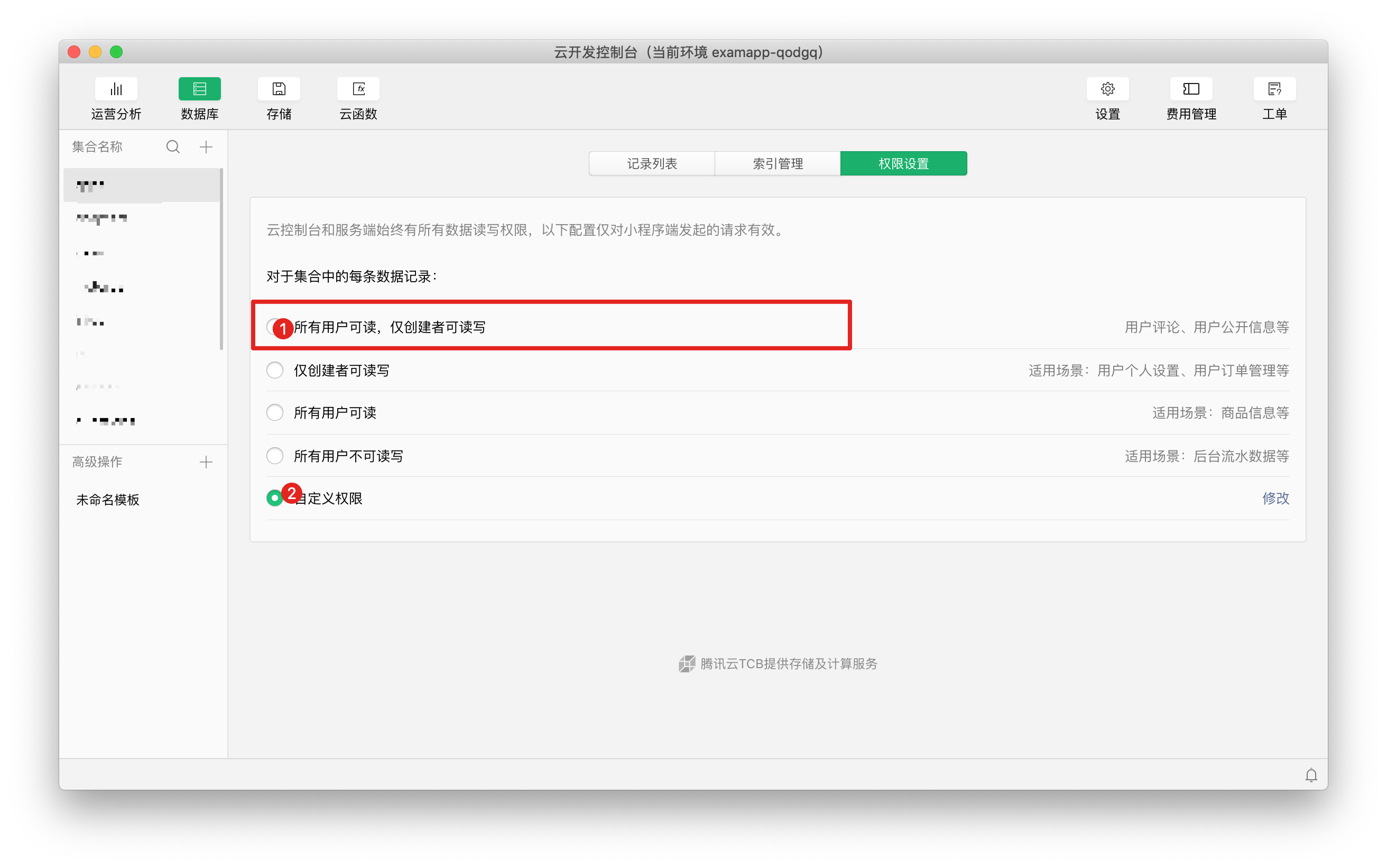 刚开始的权限是在标记①那里,也就是我在设计完集合之后,默认修改的权限,所有用户可读,仅创建者可读写。但是这次是update写操作,所以代码一直没有生效,最主要的是因为这种由权限导致的代码不work并没有任何提示,