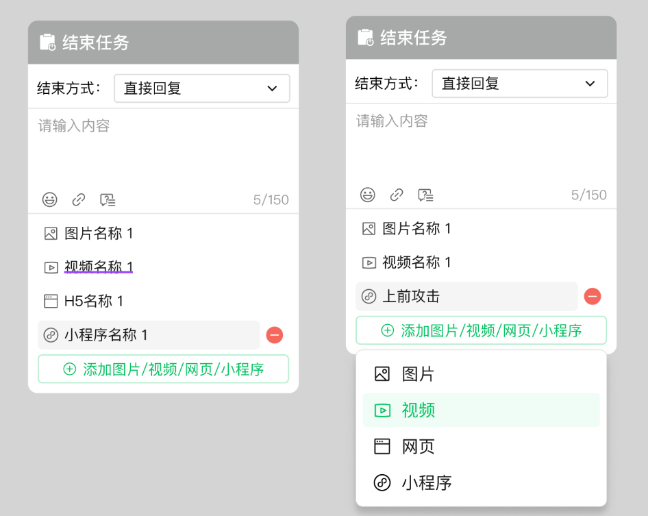 回复的消息中可插入”表情“、”超链接“,并支持最多附带3条多媒体素材消息一起发送。素材类型包含:图片、视频、小程序卡片以及网页卡片。