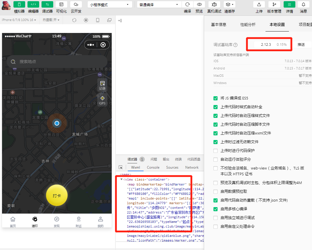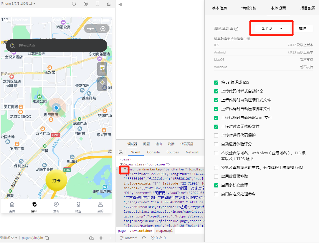 最后开始一个个对比设置有哪些不同,一项项试,终于试出来了,当基础库 > 2.12.0时,无法在调试器中看到map子组件,反之则可以看到