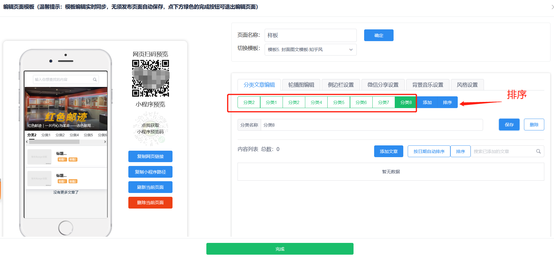 默认的页面模板是没有这个功能的,第三方的可以:例如 智未来页面模板,小布袋模板。 以前者举例:可以多于5个分类,可以突破30篇文章限制,同时可以排序: