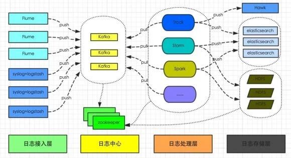 有赞从 16 年就开始构建适用于业务系统的统一日志平台,负责收集所有系统日志和业务日志,转化为流式数据,通过 flume 或者 logstash 上传到日志中心(kafka 集群),然后共 Track、Storm、Spark 及其它系统实时分析处理日志,并将日志持久化存储到 HDFS 供离线数据分析处理,或写入 ElasticSearch 提供数据查询。整体架构如图 2-1 所示。