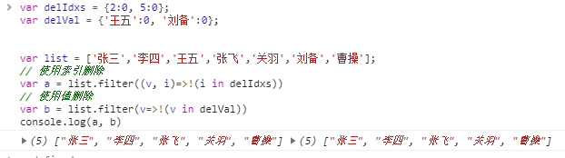 var delIdxs = {2:0, 5:0}; var delVal = {'王五':0, '刘备':0}; var list = ['张三','李四','王五','张飞','关羽','刘备','曹操']; // 使用索引删除 var a = list.filter((v, i)=>!(i in delIdxs)) // 使用值删除 var b = list.filter(v=>!(v in delVal)) console.log(a, b)若认为该回答有用,给回答者点个[ 有用 ],让答案帮助更多的人