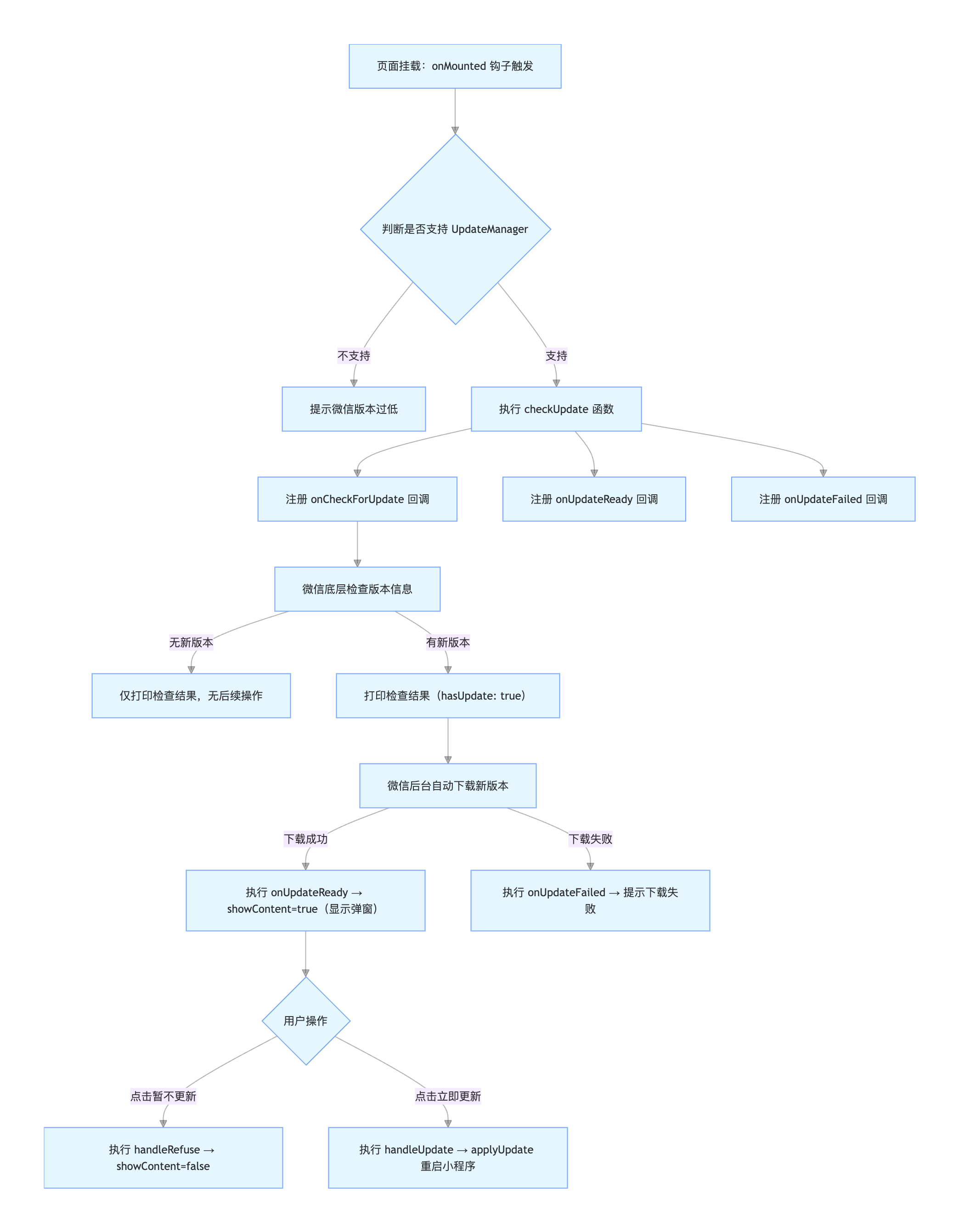 A[页面挂载:onMounted 钩子触发] --> B{判断是否支持 UpdateManager};