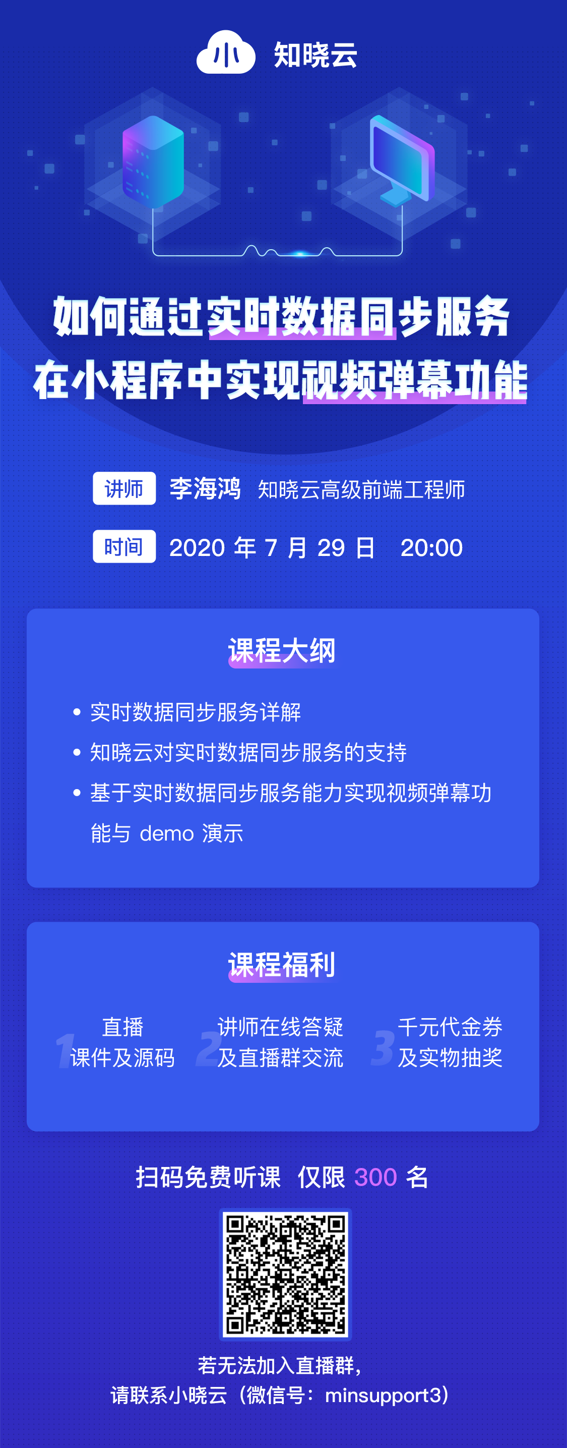 为了让企业及开发者可以更好的了解「实时数据同步服务」及其使用方法,**知晓云将于 7 月 29 日(周三)推出直播课程,以视频弹幕微信小程序 Demo 为示例,手把手教大家如何开发,为自己的小程序增加有趣的弹幕功能。**在此之前,我们还小范围开放了实时数据同步服务内测申请,让你可以提前体验并与知晓云核心工程师直接交流。👉 点此立即申请