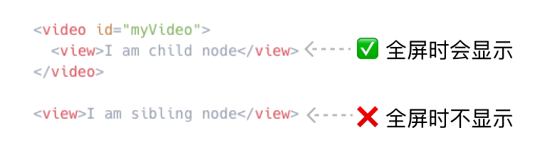 有别于非同层渲染的原生组件,像 video 和 live-player 这类组件进入全屏时,只有其子节点会被显示。