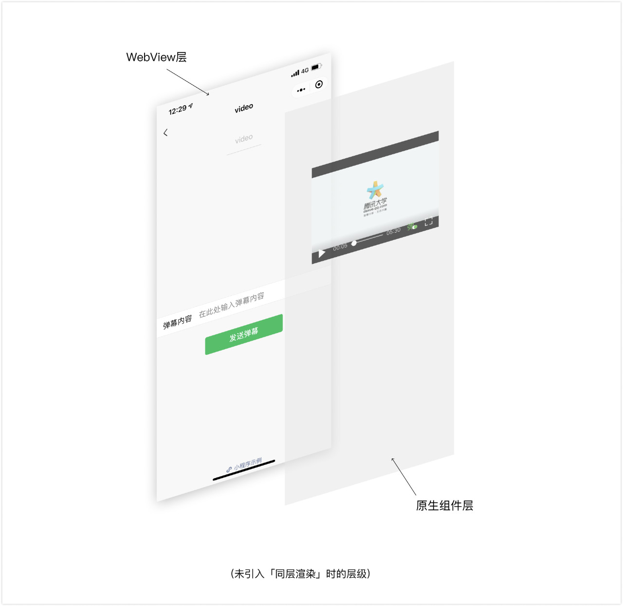 那么「同层渲染」顾名思义则是指通过一定的技术手段把原生组件直接渲染到 WebView 层级上,此时「原生组件层」已经不存在,原生组件此时已被直接挂载到 WebView 节点上。你几乎可以像使用非原生组件一样去使用「同层渲染」的原生组件,比如使用 view、image 覆盖原生组件、使用 z-index 指定原生组件的层级、把原生组件放置在 scroll-view、swiper、movable-view 等容器内,通过 WXSS 设置原生组件的样式等等。启用「同层渲染」之后的界面层级如下图所示: