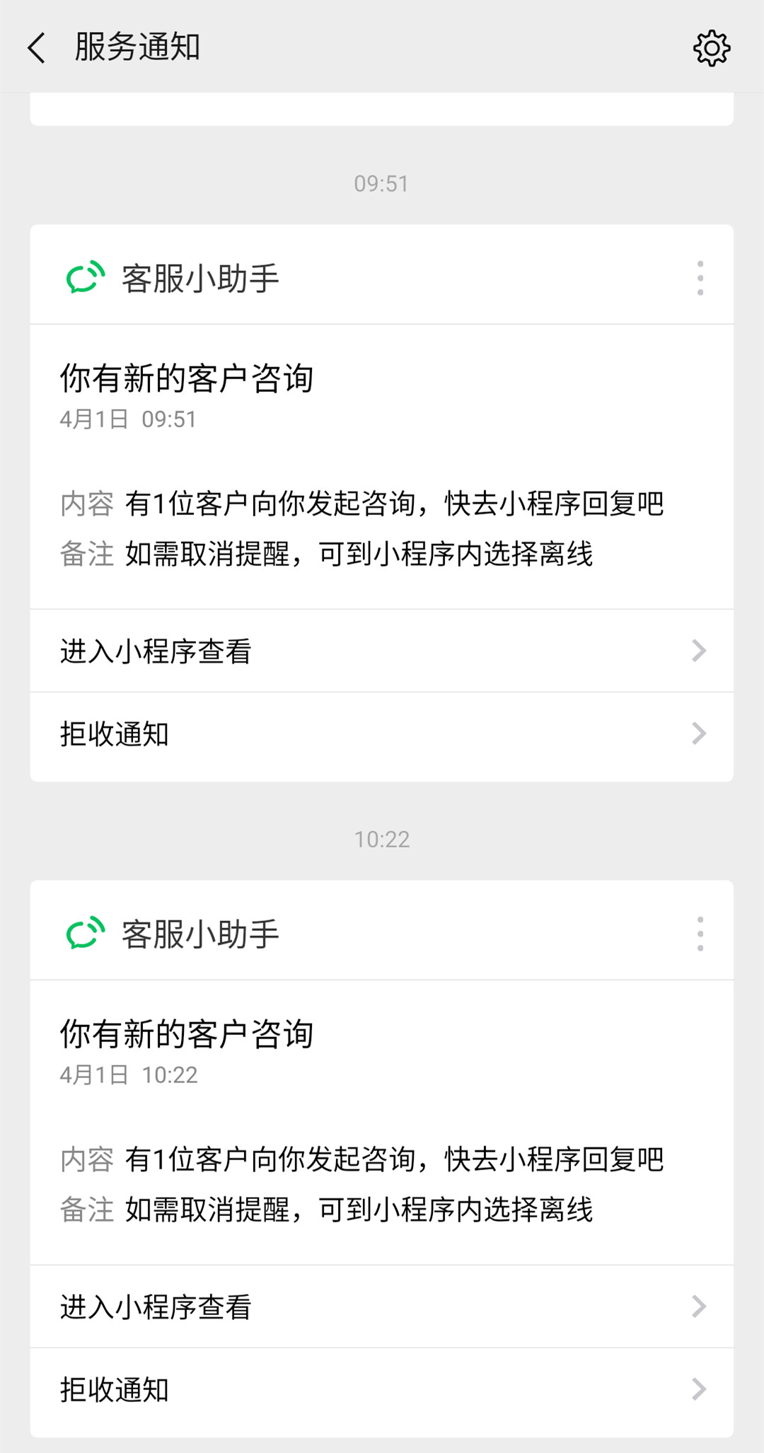 点击在线状态,可以选择在线、离开状态;选择在线状态后,即使退出客服小程序,仍可在“服务通知”中接收到客户咨询的消息提醒;选择离开状态后,将无法收到客服消息与消息提醒。