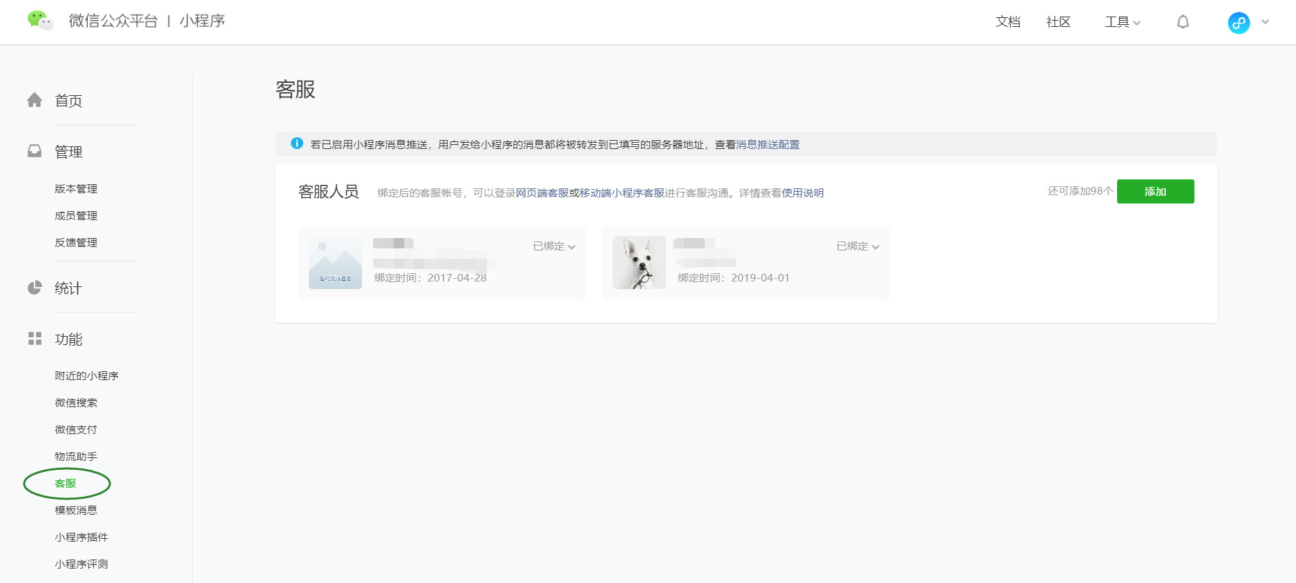 使用“客服小助手”小程序前,小程序管理员需在微信小程序管理后台完成客服人员的绑定。目前小程序支持绑定不多于100个客服人员。
