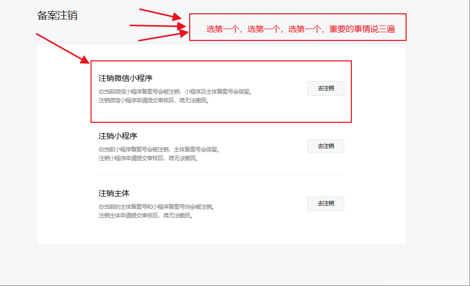 选了第三个 一直以为是注销微信这边的 小程序的备案 ,结果就是业务全崩 太坑了