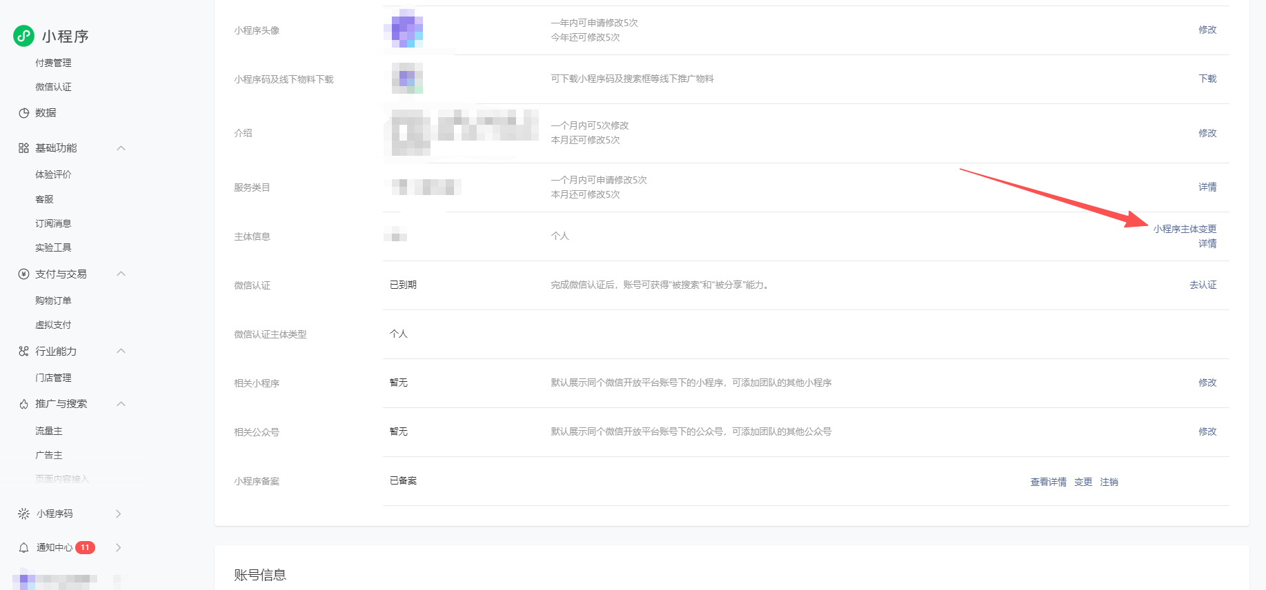 2、小程序原主体若已开通广告主功能,主体变更前须将账户余额清零;若绑定广告服务商,暂不支持主体变更。