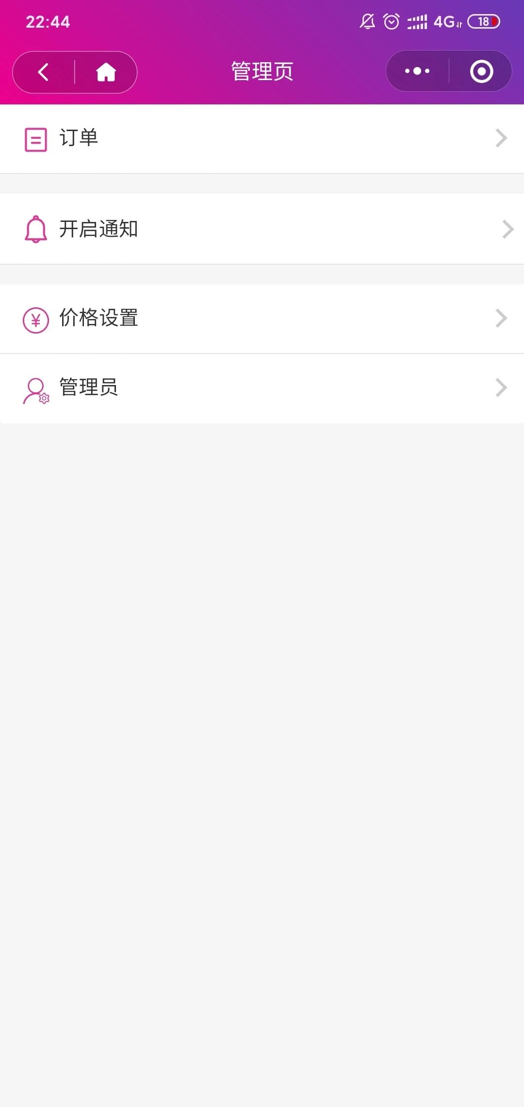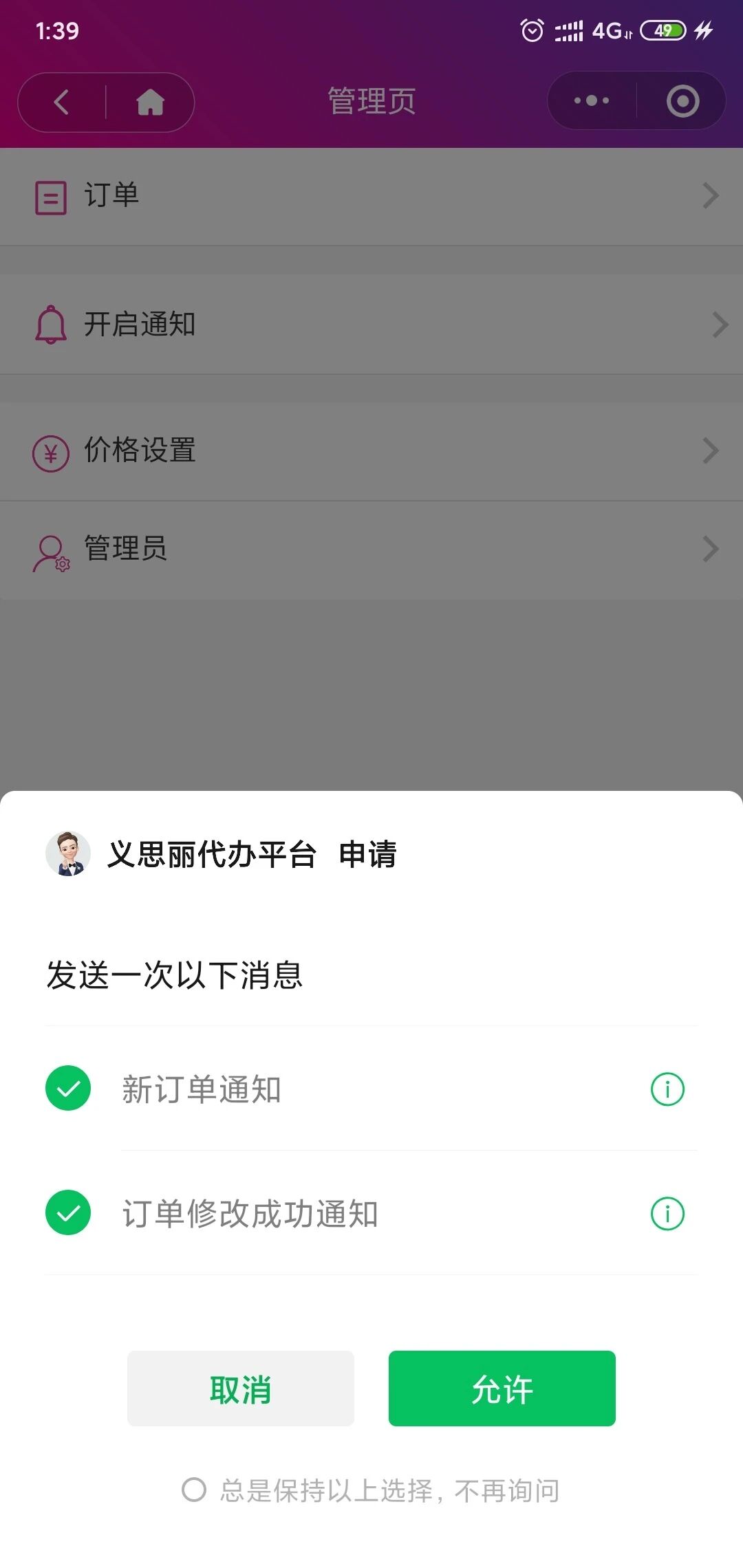 小程序使用纯小程序云开发:云函数,云存储,云数据库等。通过连续两次下滑个人页面即可进入商户管理页面,只有商户管理员才能进入,进入之后可以处理订单,设置代办费用,邀请管理员等;