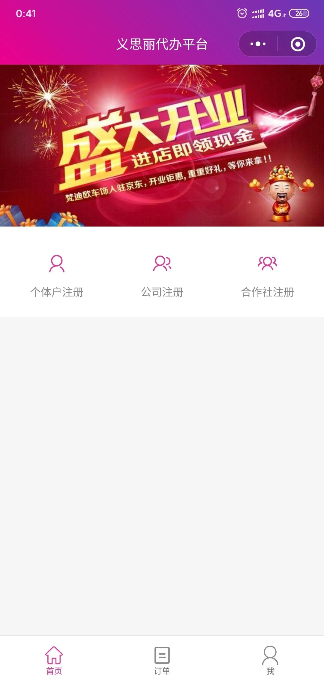 用户可以通过此小程序提交个体工商户注册、公司注册、合作社注册、商标注册订单,平台管理员可以代用户办理对应的工商执照