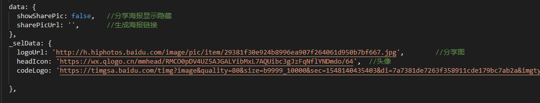 这里图片我先用的是网上的链接,实际项目中是后台返回的数据,这个可以自行处理,这里只是为了演示方便,生成临时路径的方法我这里是分别定义了一个方法,其实可以合成一个方法的,只是生成小程序码时如果要传入参数要注意一下。