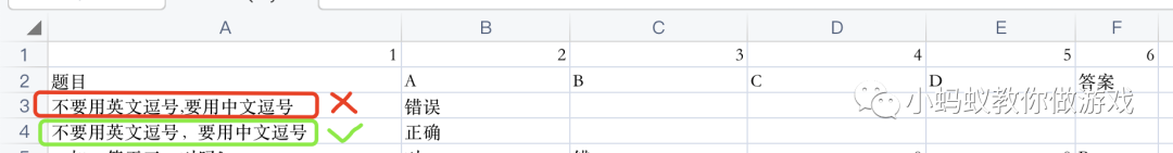 因为读取csv表格文件时,是以英文的逗号作为分隔符进行数据读取的,所以无论是问题还是答案,都要避免使用英文的逗号,若需使用逗号,应使用中文的逗号。