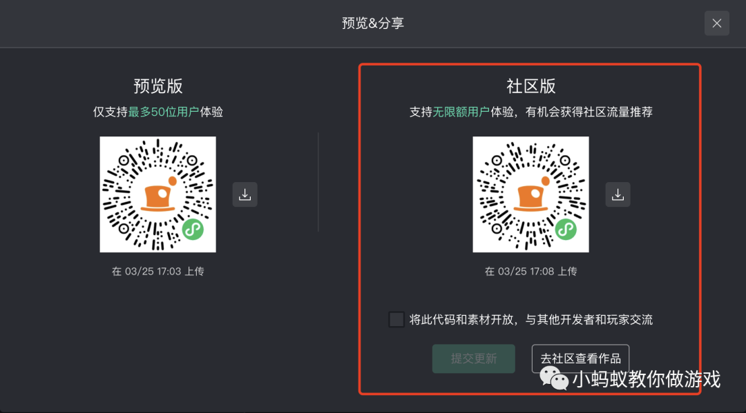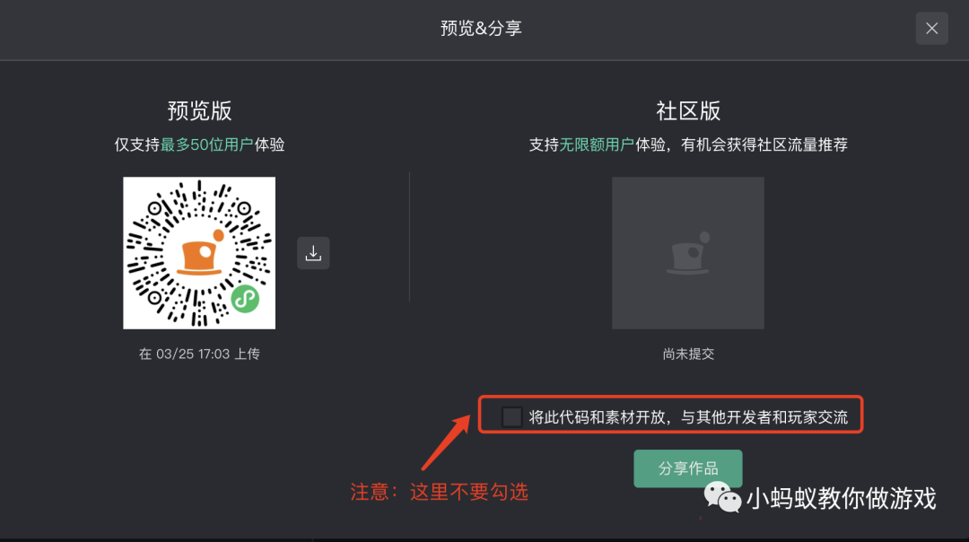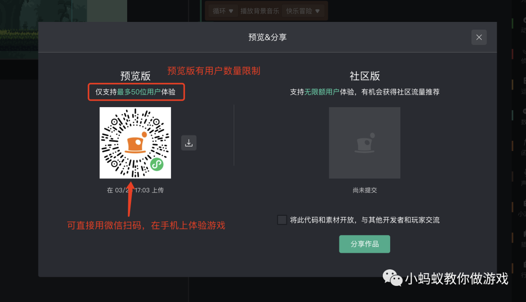 这里有两个版本,一个是预览版,最多支持 50 位用户体验。建议先用手机扫描预览版二维码,在手机上试玩测试,确保游戏没有问题之后,再点击右侧的“分享作品”按钮,发布为社区版。