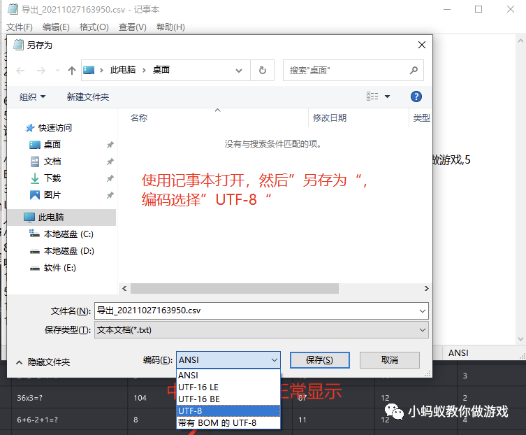 解决方法很简单,找到你的“题库表格.csv”文件然后使用记事本打开,然后选择”另存为“,此时在编码中选择”UTF-8“即可。