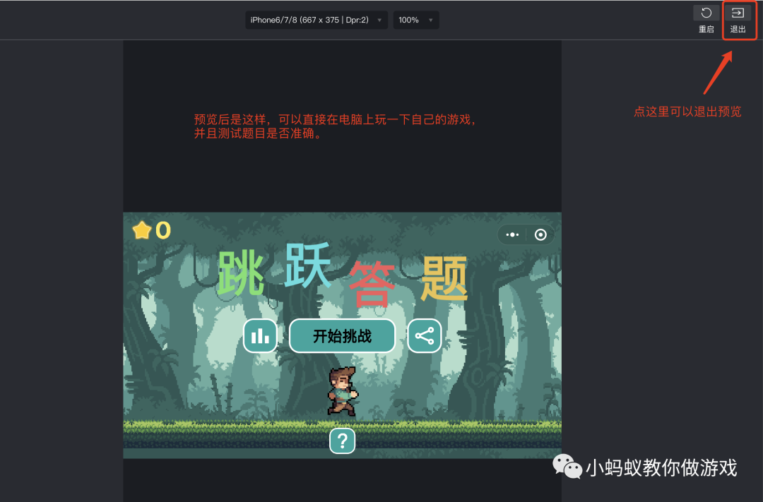 在你编辑完了自己的题库,并且进行了一些修改之后,需要让游戏运行起来测试一下。只需要点击项目上方的“预览场景”按钮,即可在电脑上运行游戏进行测试了。